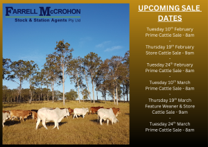 Numbers flooded in for another large Fat Sale this week. Buyer attendance was good with most processors operating. A very good line up of export cattle offered, selling to a slightly easier market. Heavy bulls sold 10 to 15 cents cheaper. Heavy cows sold firm to 10-12 cents easier. Medium and lighter weight cows taking the biggest correction 15 to 20 cents. Bullocks and export heifers sold well, selling firm to 5-10 cents easier. Good quality weaner cattle continue to sell firm whilst secondary cattle followed trends selling cheaper. Next Thursday 19th February is our monthly Store Sale. Bookings are invited and reccommended.
